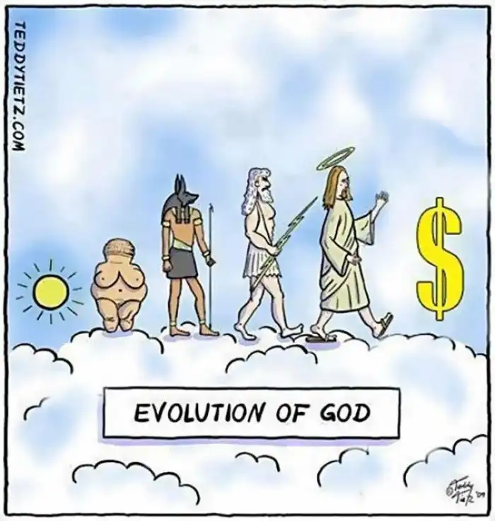 «Эволюция бога» означает «эволюцию того, чему поклоняются люди», и человечество перешло от поклонения божествам к поклонению доллару.