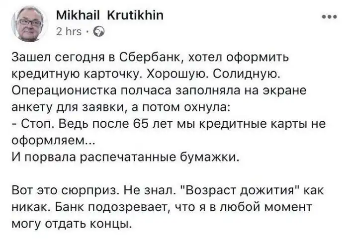 1. После 65 кредитные карты не оформляем.