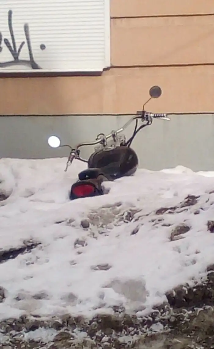 А так тот же самый мотоцикл выглядел две недели назад. Тогда снега было явно больше