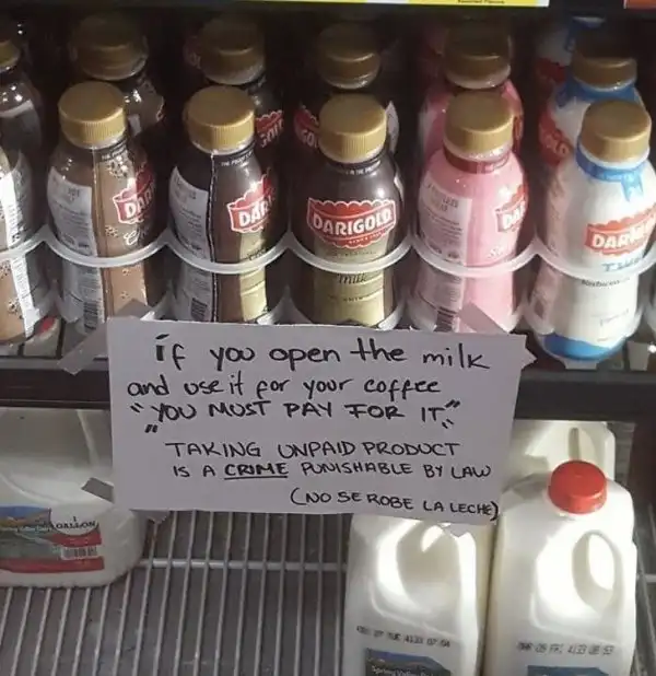 «Если вы откроете молоко и используете его для своего кофе, вы должны будете за него заплатить. Брать неоплаченный товар — преступление, наказуемое по закону».