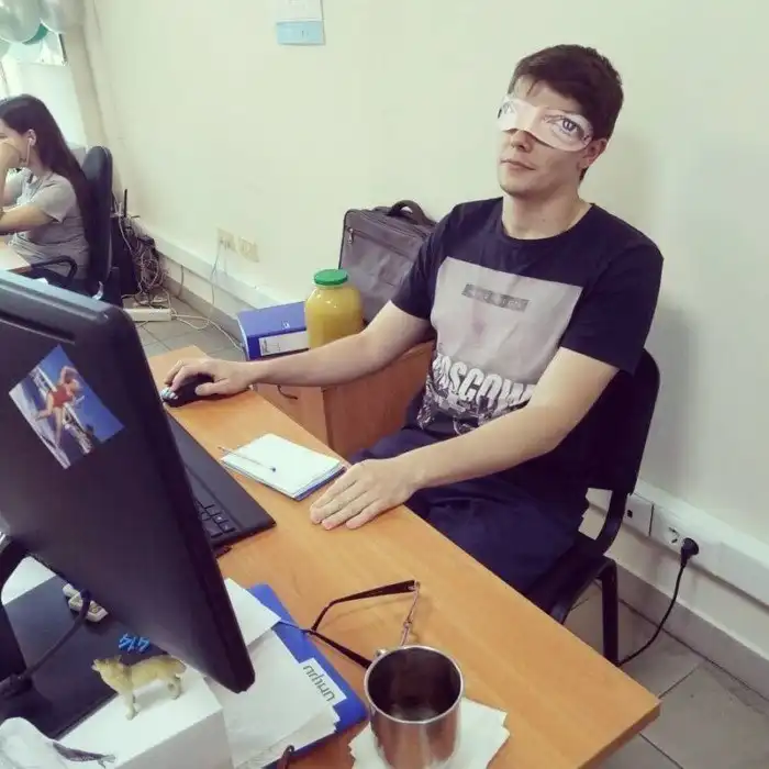 Этот парень пользуется офисными очками для сна. Коллеги пугаются.