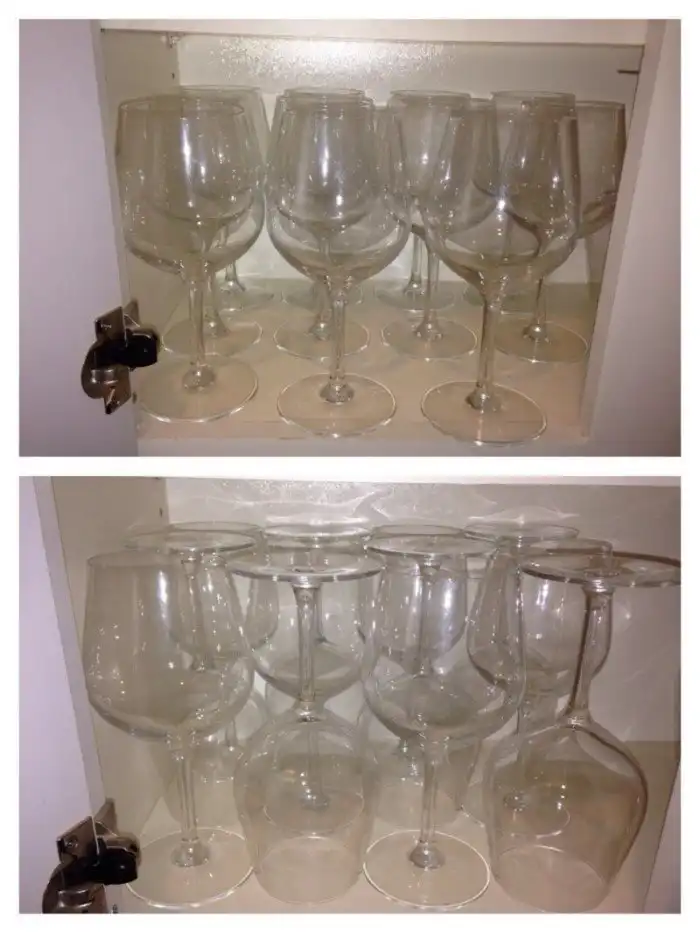 "Я купил набор из 12 бокалов, но на полке умещалось лишь 11. Подумал и нашел способ, как поместить все - еще и место осталось!".