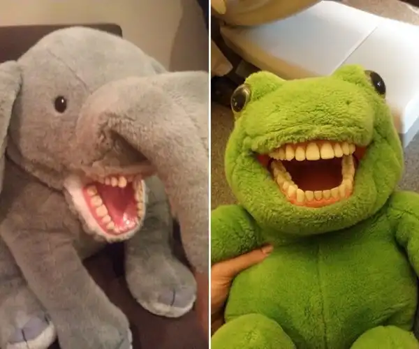 Игрушки со вставной челюстью призваны научить детей ухаживать за полостью рта и успокоить перед стоматологическими процедурами. Однако плюшевые "помощники" способны вселить ужас даже в родителей! Бедная детская психика...