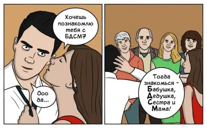 Моя шестилетняя сестра нарисовала нашу счастливую семью, а снизу подписала: «Я люблю БДСМ!» На вопрос, что это значит, искренне ответила: «Я люблю Бабушку, Дедушку, Сестру и Маму!»