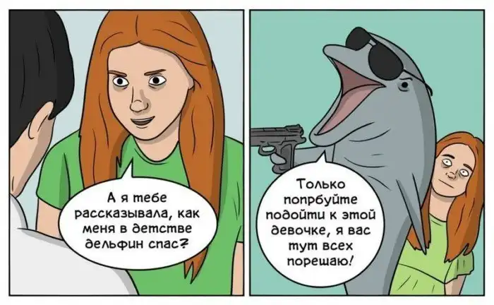 Было мне 10 лет, мы с семьёй отдыхали на море. Я уселась в свой круг и погребла. Сама не заметила, как уплыла очень далеко; так, что береговая линия была едва видна. Повернулась я и гребу обратно, а через некоторое время почувствовала толчок в спину. Испугалась страшно, так как насмотрелась ужастиков, где человека заживо сжирала акула. Поворачиваюсь, а это… ДЕЛЬФИН. Так он и «притолкал» меня к самому берегу и уплыл, взмахнув хвостом. Весь пляж был в шоке, а брат до сих пор с завистью вспоминает.
