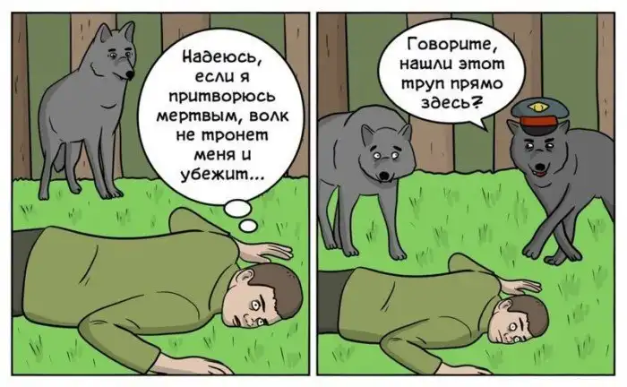 Приехал к бабушке, вечером пошел гулял, потом домой. Дорога домой проходит через огороды, пройдя метров 200 — встретил волка. И тут я вспомнил как бабуля мне глаголила: «Встретишь волка, ляг, он [пометит] тебя и убежит». И он реально [пометил] и убежал…