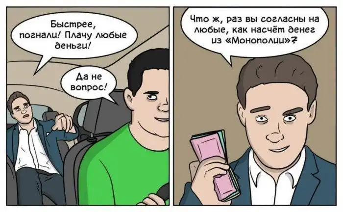 Работаю таксистом и сегодня сбылась мечта всей жизни: прибежал мужик, сел в машину и сказал: «Плачу любые деньги! Следуйте за той машиной!» [Блин], как я счастлив!