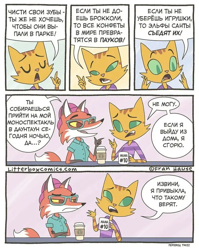 Маму зовут Франческа Хаус, и она производит на свет не только детишек, но и серию рисованных историй LitterboxComics для своих 52 тысяч подписчиков. Одна оговорка: в комиксах нет людей, так как Франческа ненавидит их рисовать. Поэтому все реальные ситуации, знакомые каждой маме-человеку (и папе), переживают котики. Поехали!