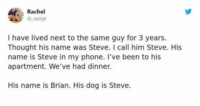 "Я уже три года живу по соседству с парнем. Всю дорогу думала, что его зовут Стив. Я называла его Стивом, и у меня в телефоне он записан как Стив. Недавно он пригласил меня к себе домой на ужин. Оказывается, его зовут Брайан. А его собаку - Стив".