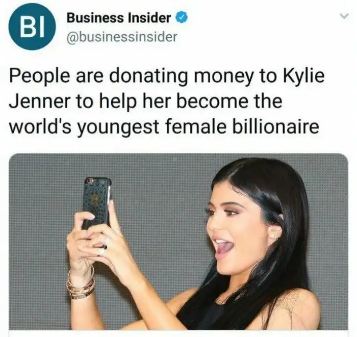 "Люди жертвуют деньги Кайли Дженнер, чтобы помочь ей стать самой молодой в мире миллиардершей". Да, это реальный заголовок из СМИ. Да, мы одурели.