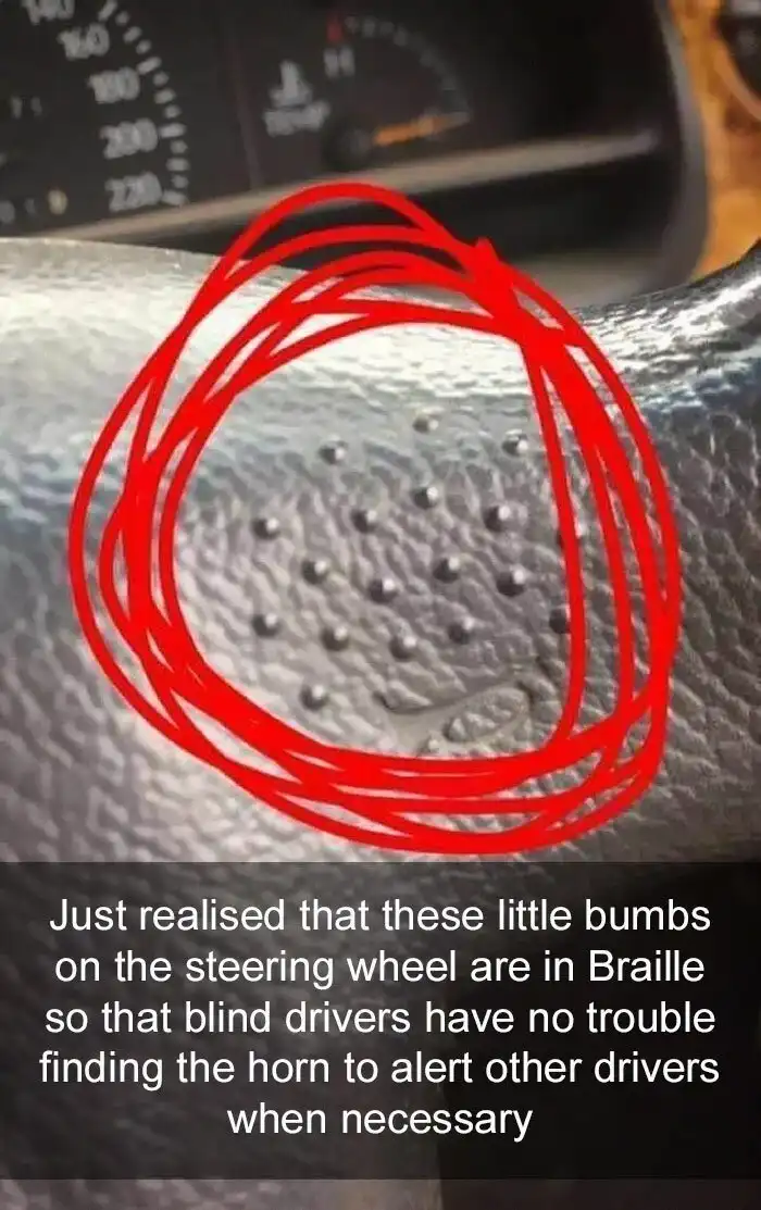 "Я только что поняла, что это точечное тиснение на руле - на самом деле, азбука Брайля. С ней слепые водители легко находят клаксон и гудят, когда требуется".