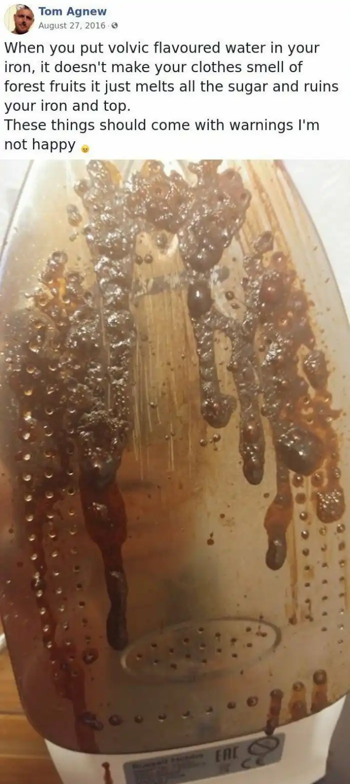 "Оказывается, если залить в утюг фруктовый лимонад, он не придаст вещам запах фруктов, а прикипит к подошве утюга, так как сахар расплавится, и испортит утюг и вещи. Вообще-то о таких вещах надо в инструкции писать. Я очень недовольна".