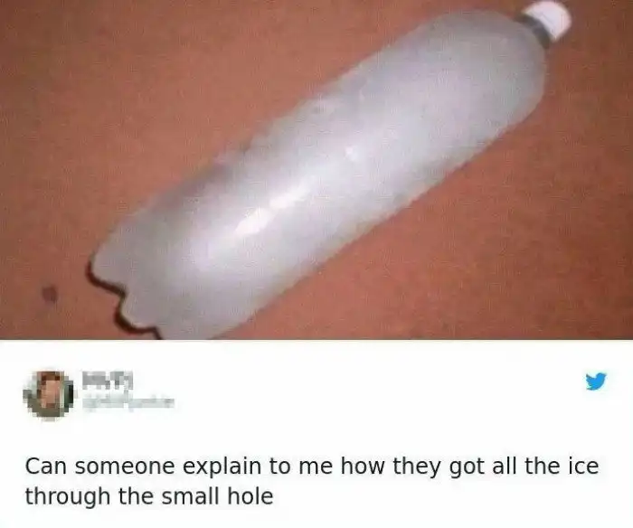 "Расскажите мне, пожалуйста, в чем фокус: как они смогли напихать полную бутылку льда через такую маленькую дырочку?"