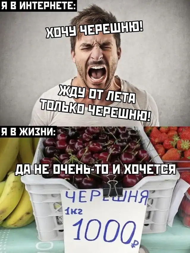 Лето только началось, а народ уже вовсю требует черешни. С конца мая до средины июля ягодка созревает, после чего начинается кульминация хотения черешни. В этом году "черешному" периоду решили посвятить мем. Вот, что получилось у мемоделов Рунета.
