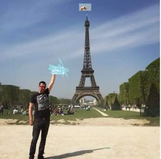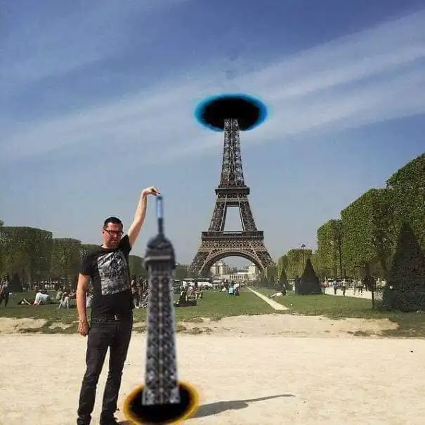 "Привет, мне нужна помощь. Кто-то знает фотошоп? Я хотел бы, чтобы мой палец касался кончика Эйфелевой башни. Спасибо!"