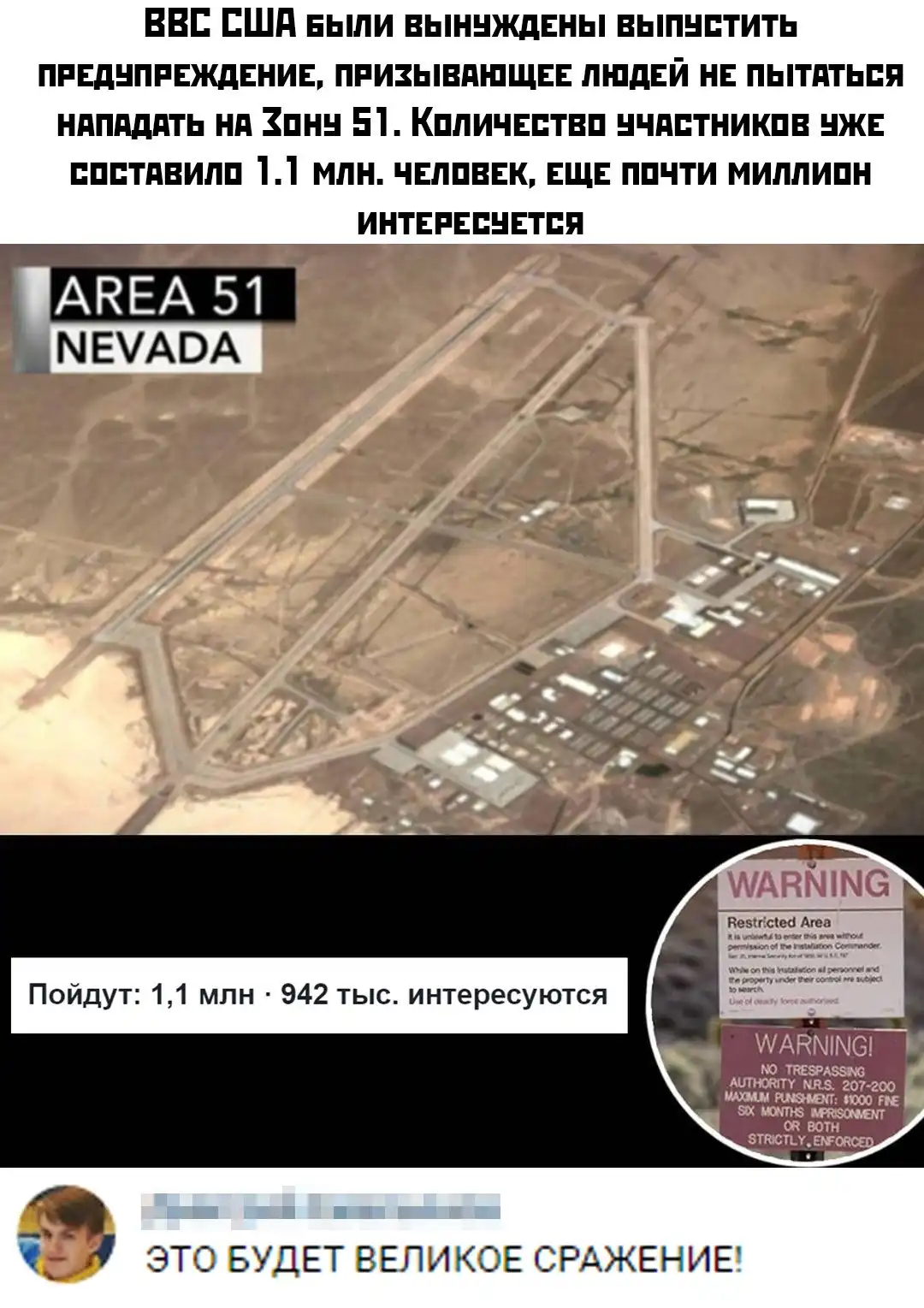 В итоге ребята из "Shitposting cause im in shambles" задумали штурм этой секретной базы ради того, чтобы "украсть немного инопланетных технологий и завести себе домашнего пришельца".