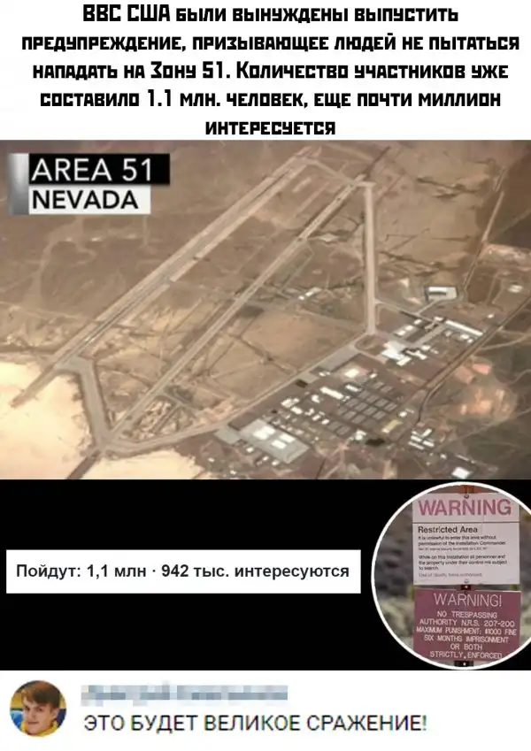 Если коротко, то штурм "Зоны 51" - это пранк, вышедший из под контроля. На днях в Facebook запостили ивент с таким лозунгом: "Штурм зоны 51, они не могут остановить нас всех". Приглашение, естественно, являлось обыкновенной шуткой, но всего за пару дней на "мероприятие" подписалось более миллиона человек.