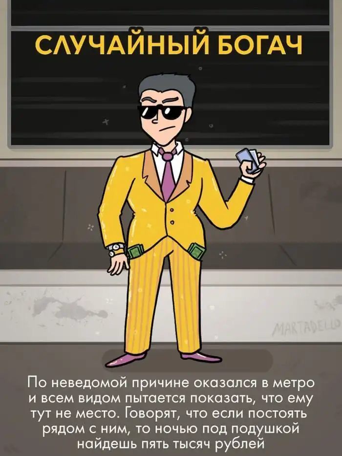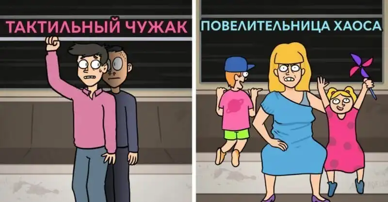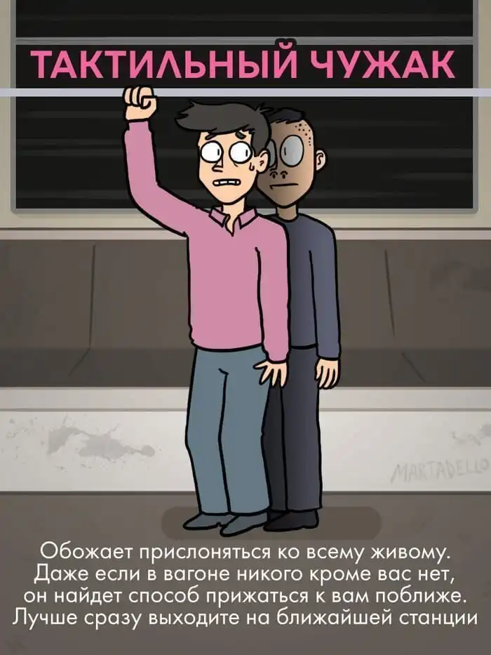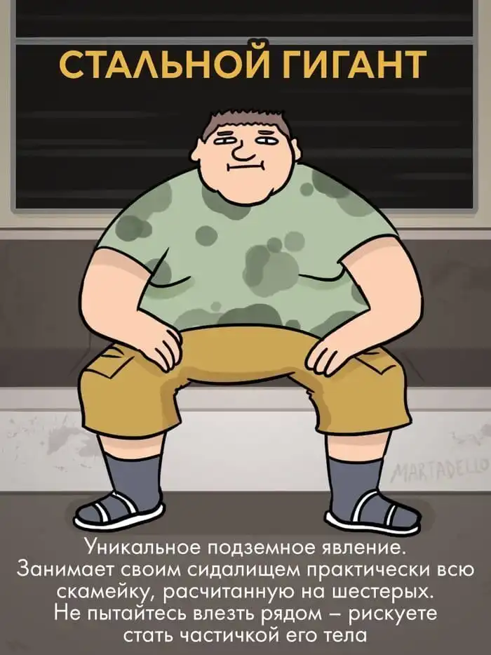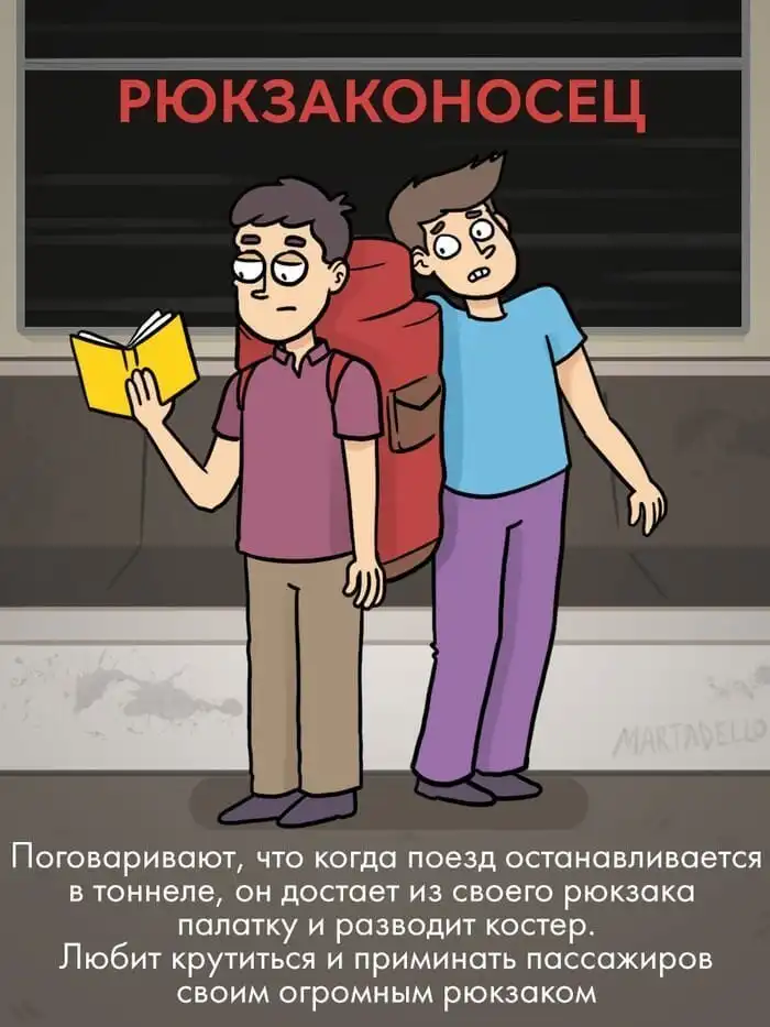 Метро — это отдельная экосистема, каждый участник которой занимает своё положение в местной пищевой цепочке. Художник Martdello добавил к своей классификации ещё несколько типажей, которые сделают даже рутинное путешествие по подземке просто незабываемым! Для полноты погружения в чудный мир обитателей метро, описания к типажам рекомендуется читать голосом Николая Дроздова.