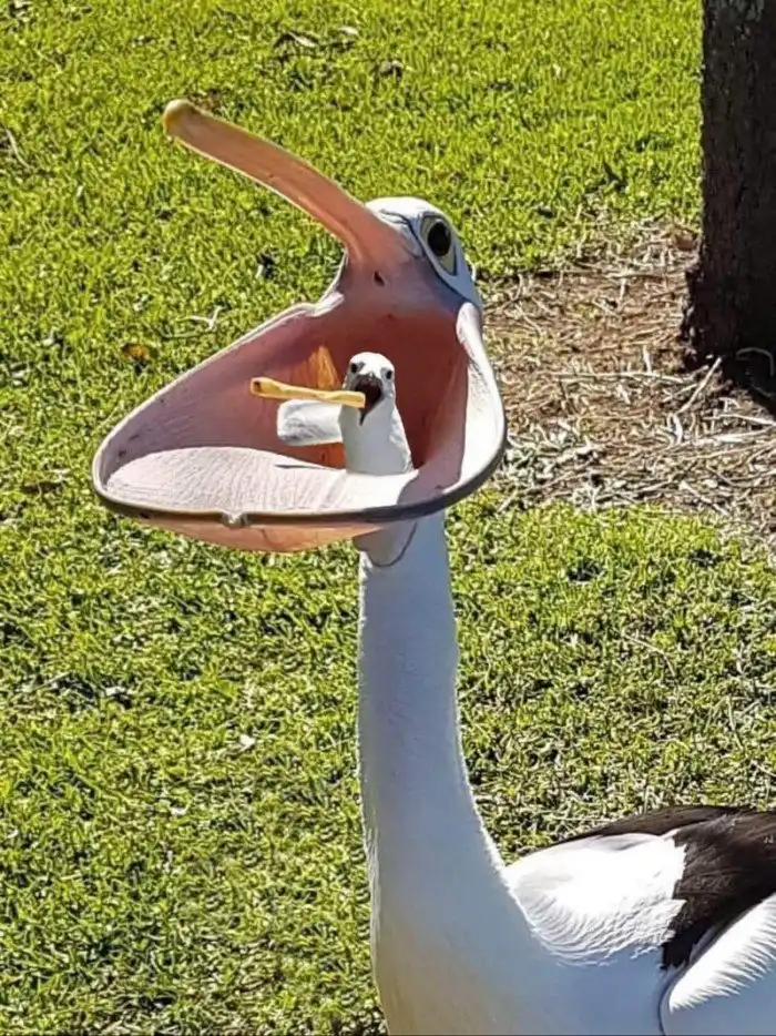 Исходное фото пеликана с грандиозной варежкой и птички-ассистента