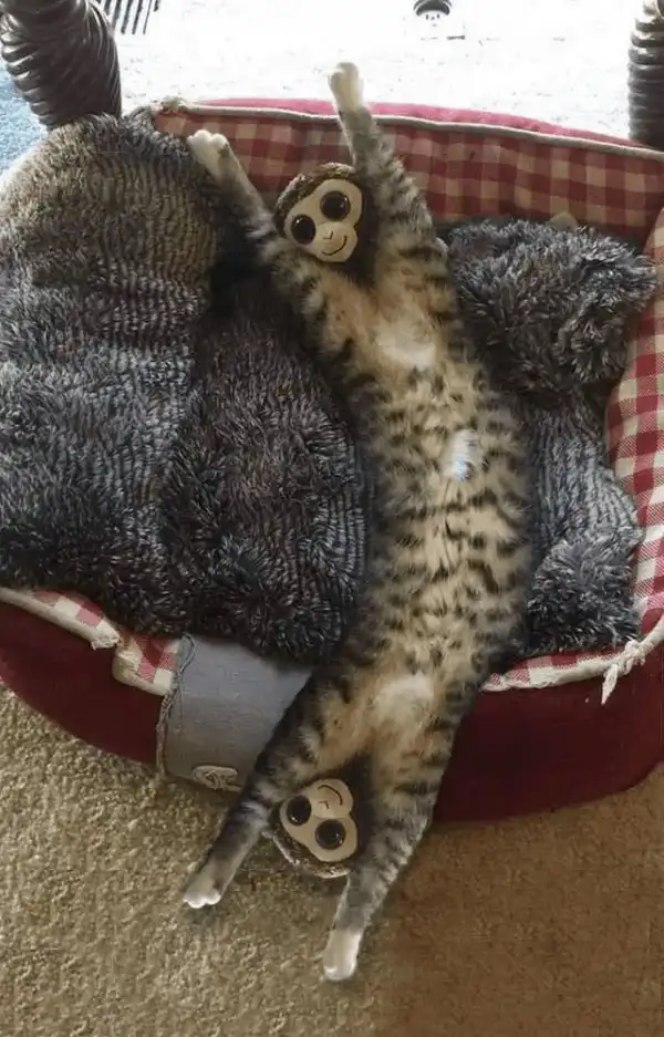 По социальным сетям пулей разлетелась, казалось бы, самая обычная фотография. Котик спит на диване среди игрушек. Но котофей растянулся таким образом, что в неожиданном месте образовалась обезьянка. Получилось довольно забавно и психоделично. Для пользователей социальных сетей и любителей фотошопа такая фотография стала настоящим вызовом для проверки их способностей.