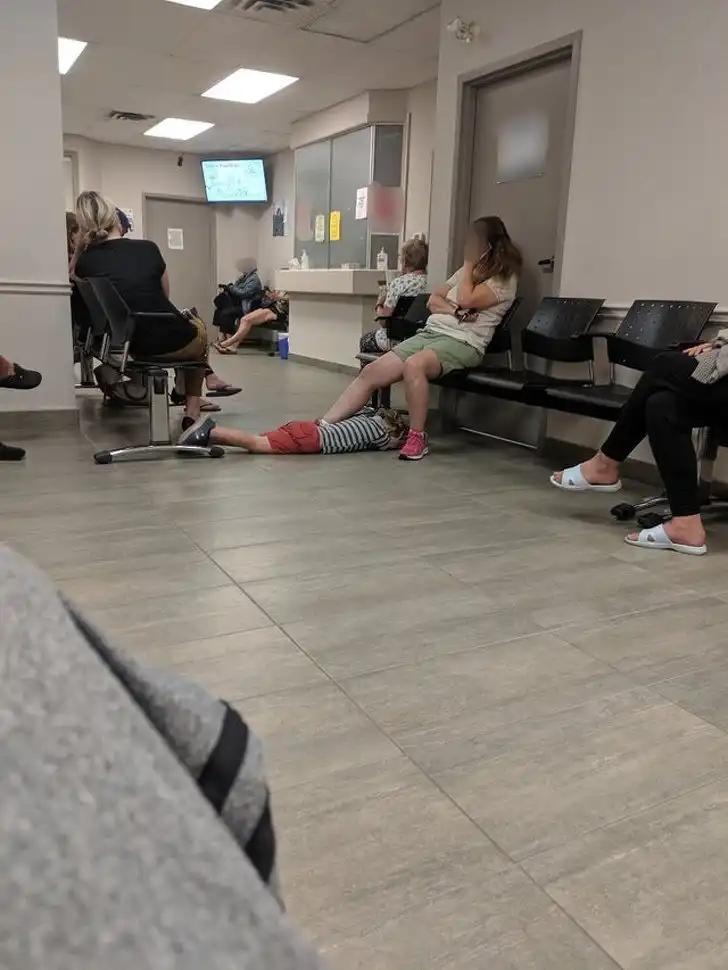 13. Пока мама говорит по телефону, сидя в очереди к врачу, ребенок кашляет без маски, валяясь на полу