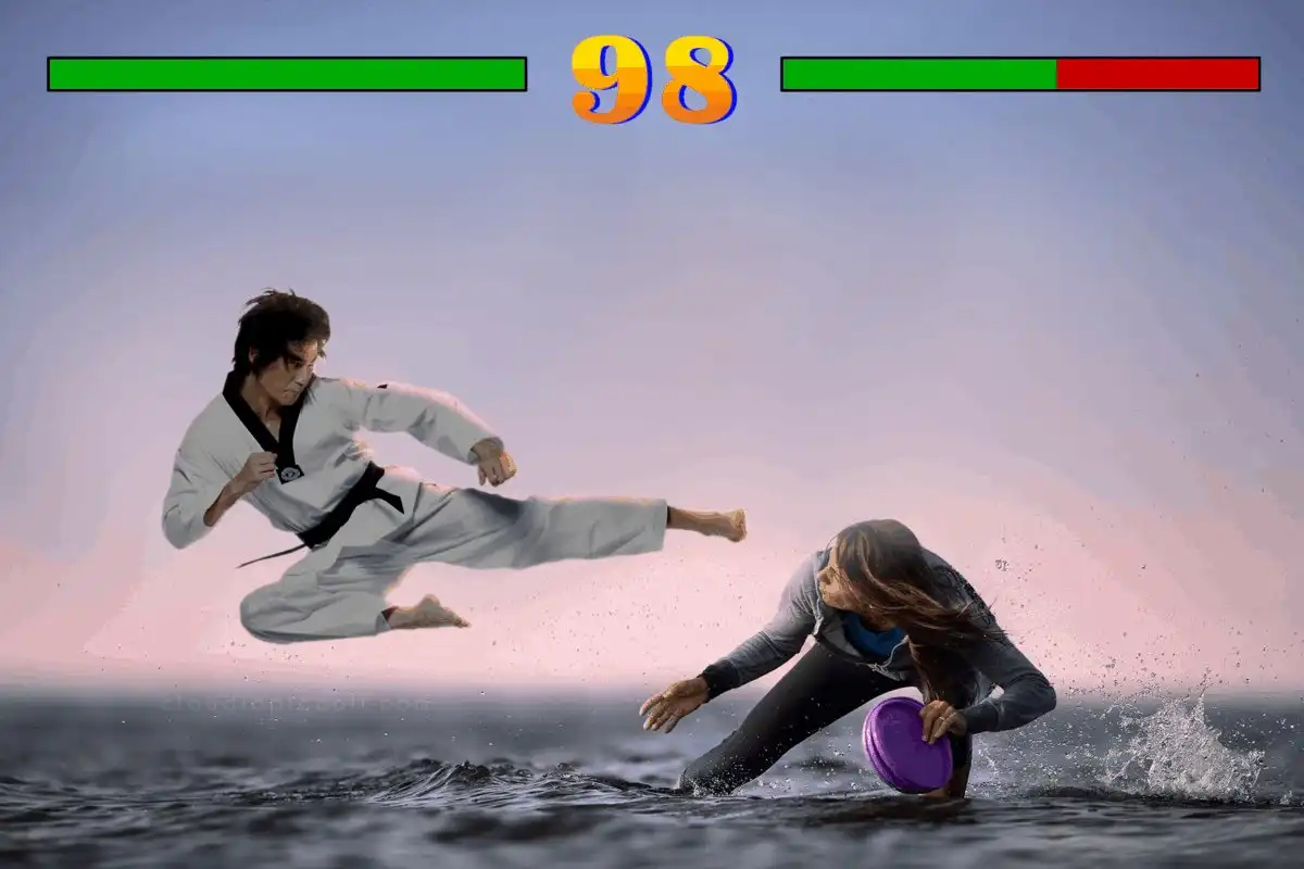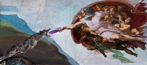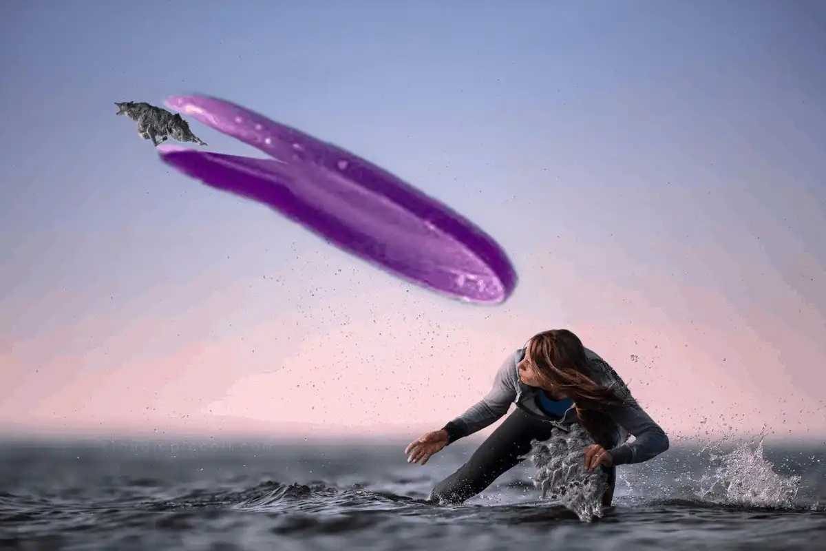 Недавно в Сети появилась фотография, на которой запечатлён пёс, пытающийся в прыжке поймать фрисби. Кадр действительно получился красивым - брызги воды, клыкастая пасть, готовая сомкнуться на фиолетовой тарелке, и розовеющий закат на фоне. По какой-то причине фотография стала очень популярной, а посмеяться над ней решили пользователи сети, вооружившись своими знаниями об обработке изображений в "Фотошопе".