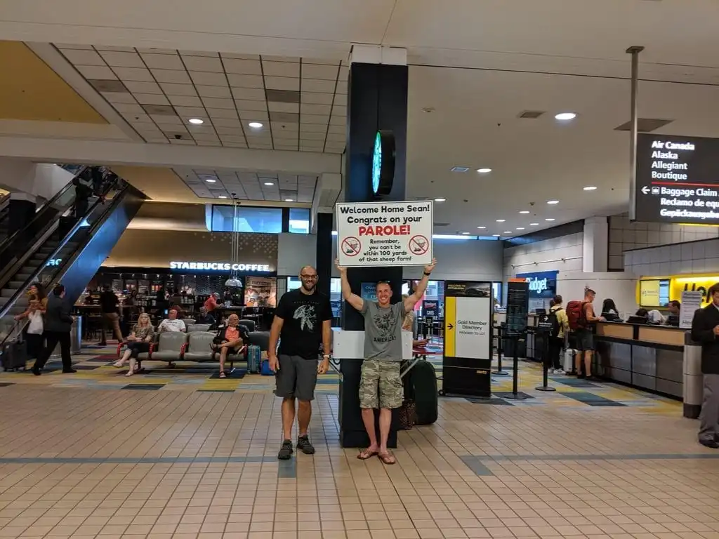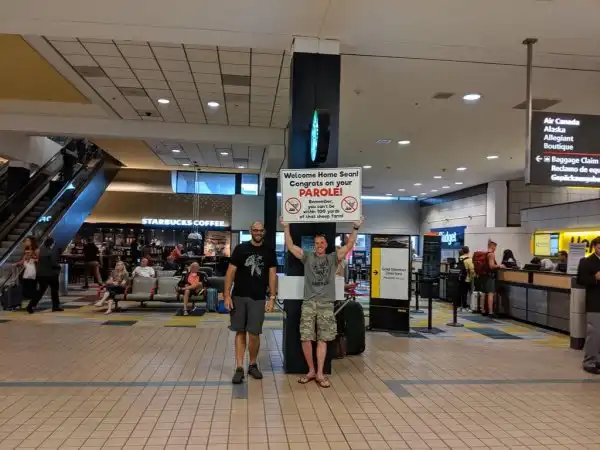 Парни встречают друга в аэропорту с табличкой "Поздравляем с УДО"