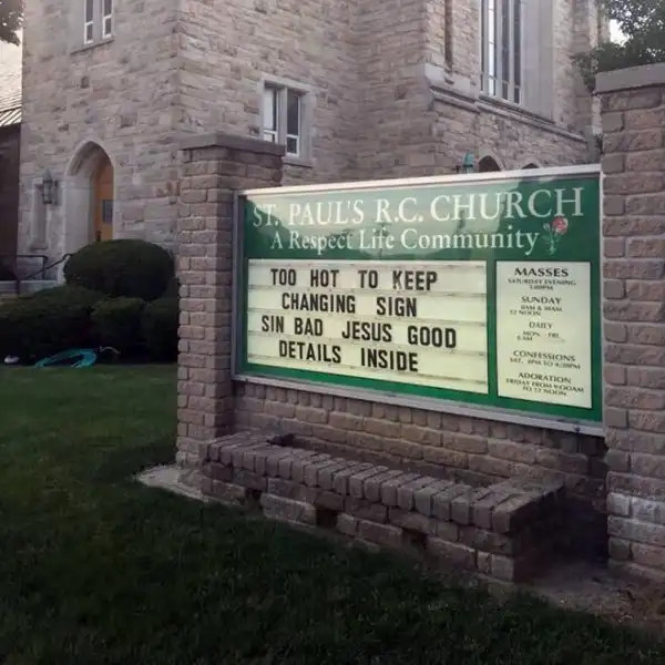 Надпись: "Слишком жарко, чтобы менять надпись. Грех - плохо, Иисус - хорошо, детали - внутри"