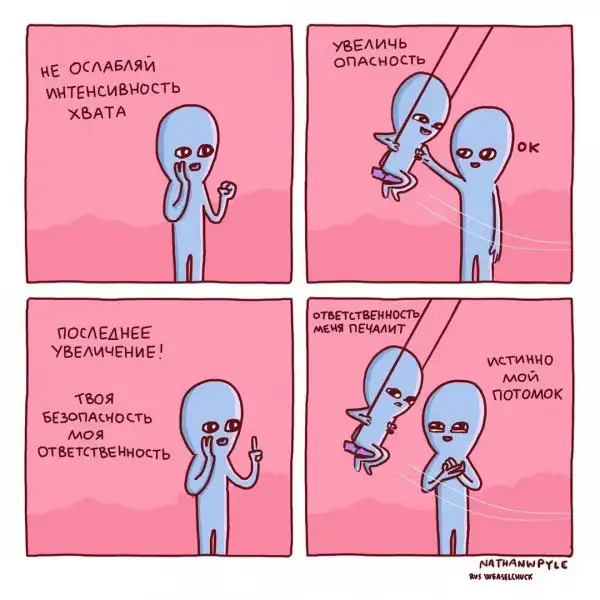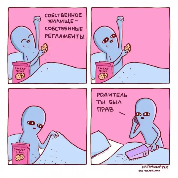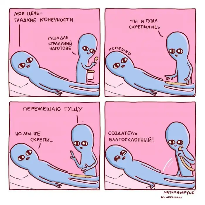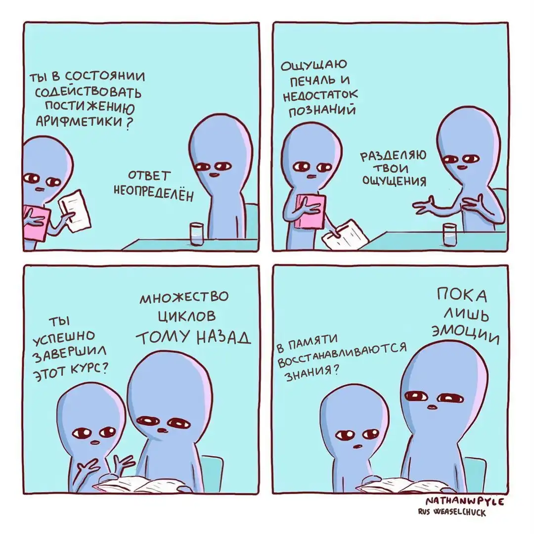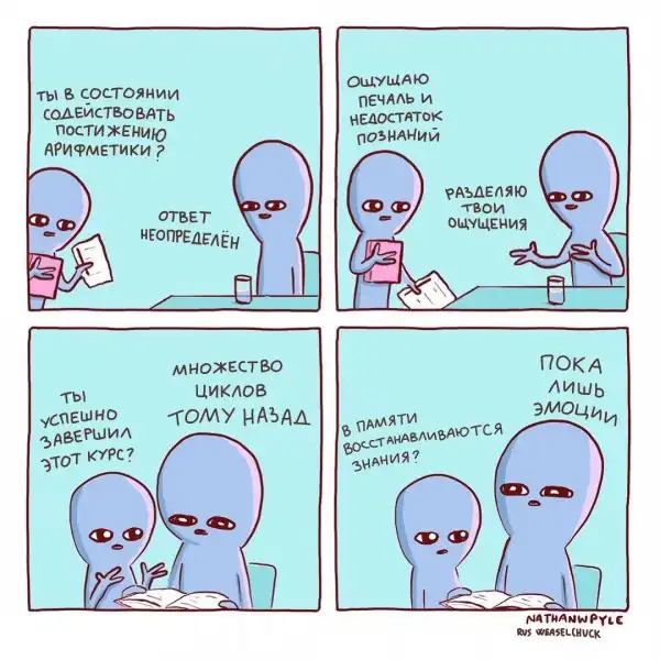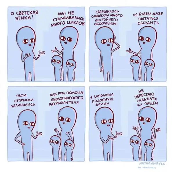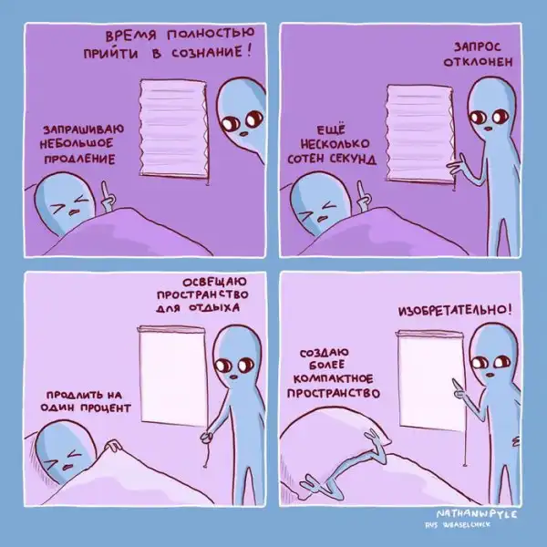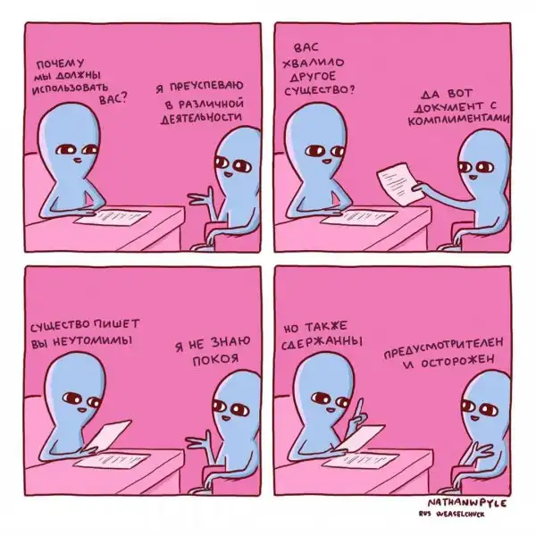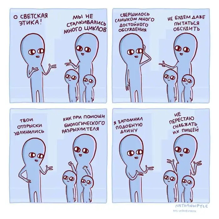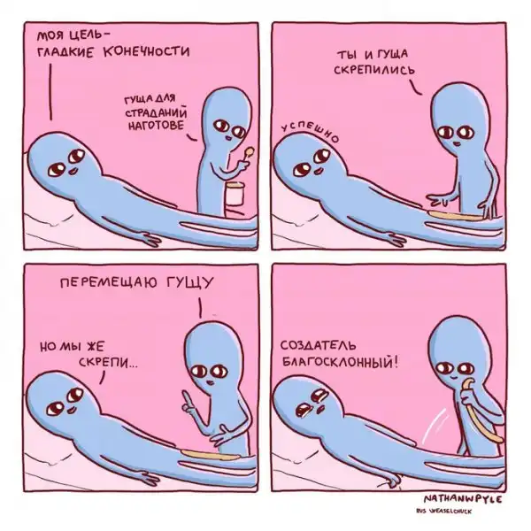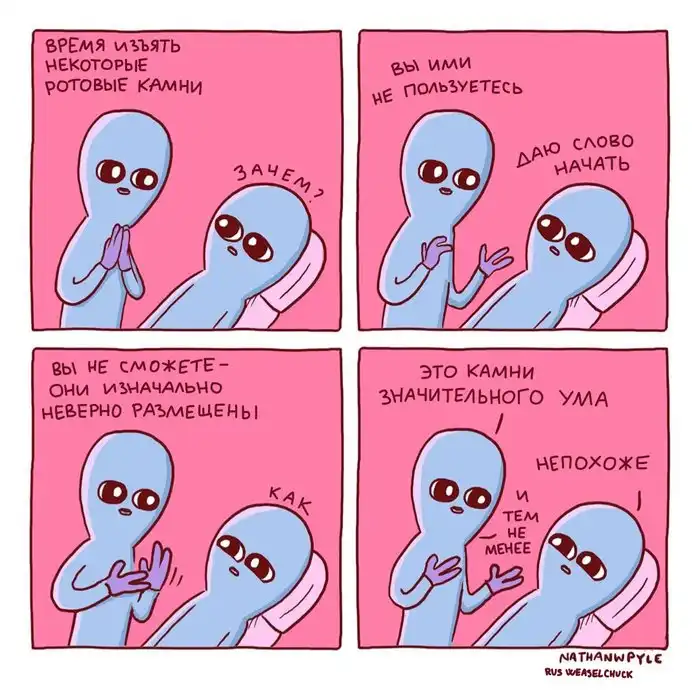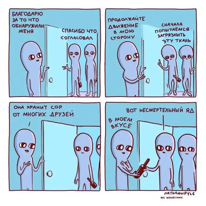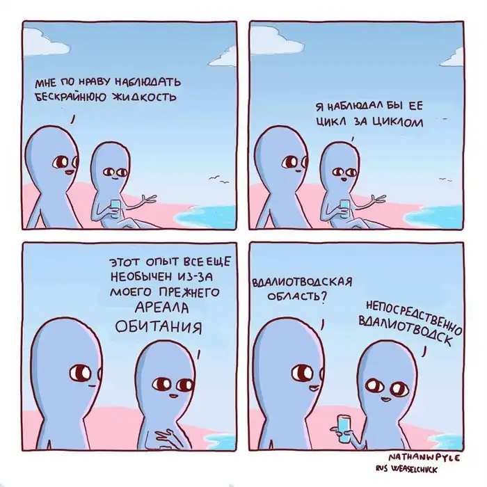 Художник из США Натан Пайл создаёт очень забавные комиксы, изображая синих инопланетян, которые ведут себя как обычные люди, но выглядят при этом очень смешно. Действительно, ситуации, которые изображены на иллюстрациях, являются для нас обыденными, но одновременно и абсурдными.