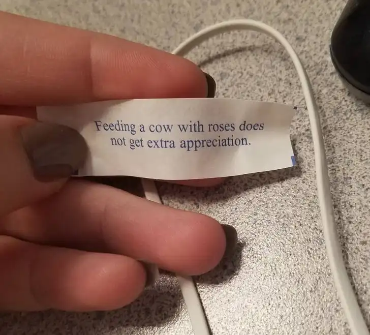 15. «Я подбросил жене печеньку с предсказанием в контейнер с ее обедом. Она в гневе прислала это фото. Будто я сам печатаю предсказания и специально подсунул именно это»