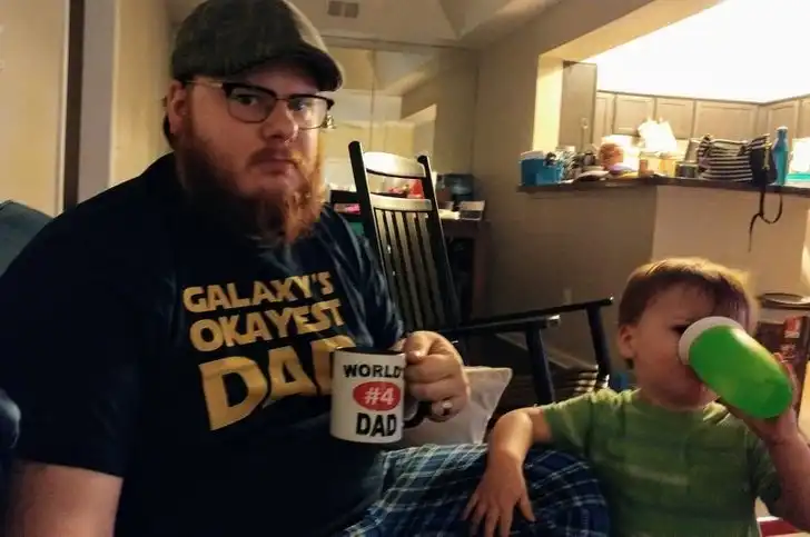 Надпись на футболке: «Самый „окейный“ отец в Галактике». Надпись на кружке: «Отец № 4 в мире».