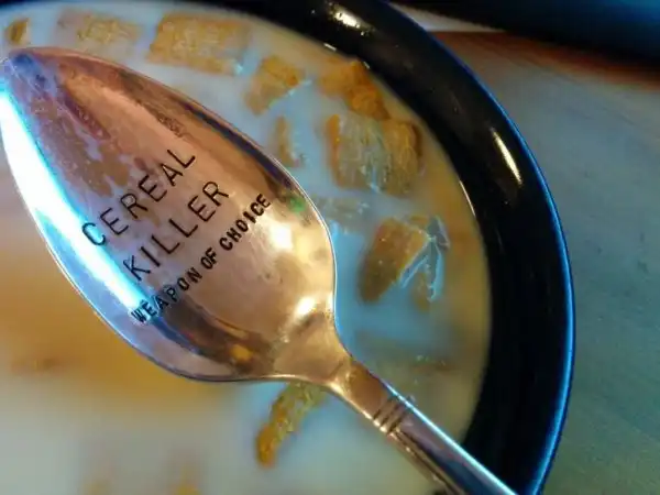 Надпись на ложке — игра слов: сereal killer — «убийца овсянки». Cereal звучит так же, как serial. Serial killer, в свою очередь, переводится как «серийный убийца». Weapon of choice — «любимое оружие».