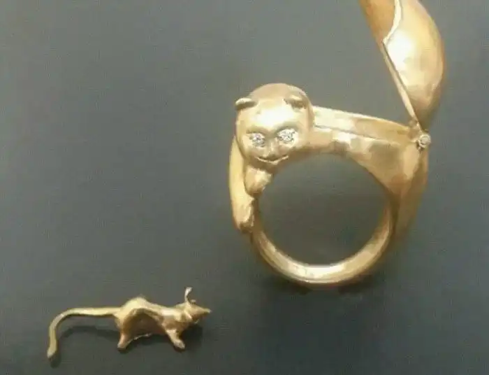 26. Уникальное кольцо "Кошка и мышь" из стерлингового серебра (покрытое 18-каратным золотом) с бриллиантами. 330 долларов