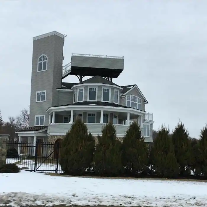 Кажется, кто-то увидел этот дом и сказал: "О, тут не хватает башни и вышки для прыжков в воду"
