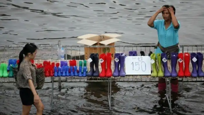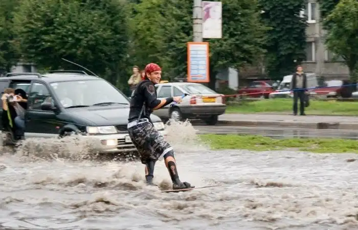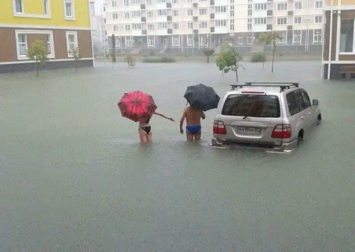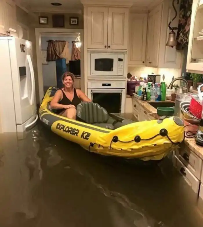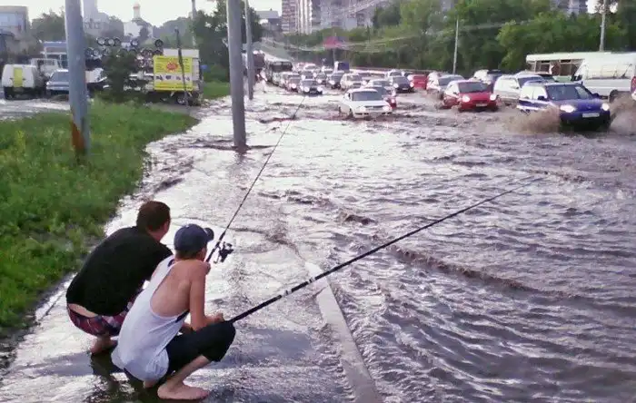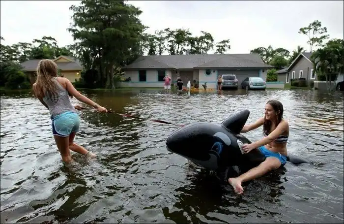 Иногда только и остаётся, что фотографировать и пытаться хоть как-то насладиться происходящим. Слегка странноватая подборка о том, что люди делают во время наводнений.
