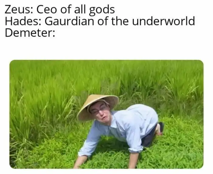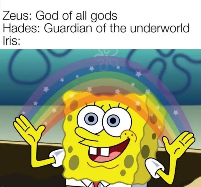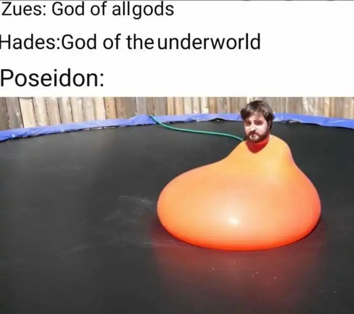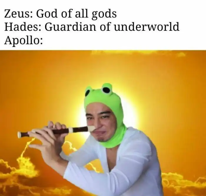 Мем устроен проще простого. Сначала идёт Зевс, который описывается, как бог всех богов, начальник и повелитель грома и молнии. Затем другой бог, в подавляющем большинстве случаев Аид, повелитель подземного царства. Ну и на десерт — главный герой, которого и опишет смешная картинка, следующая за ним.