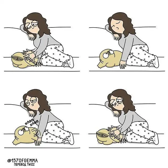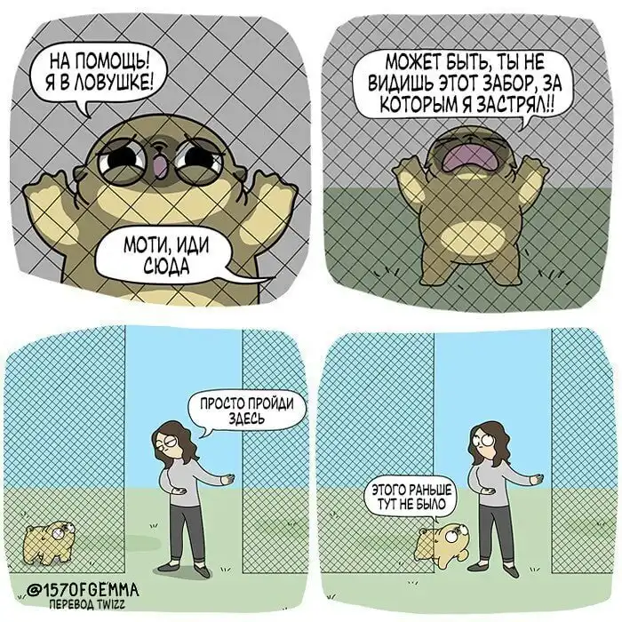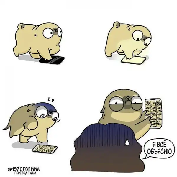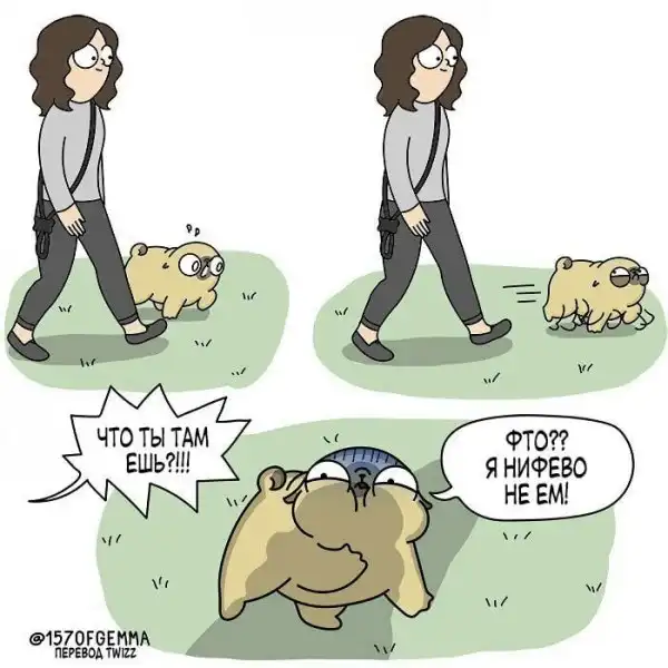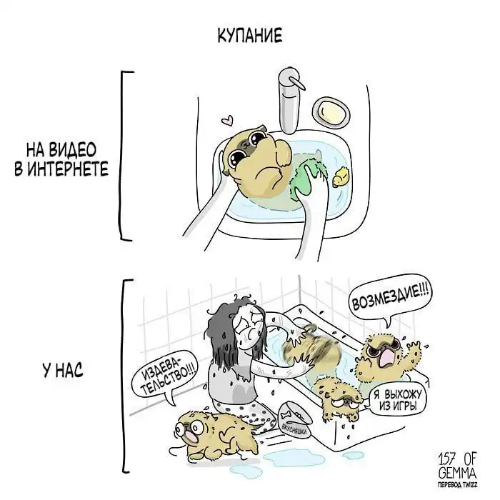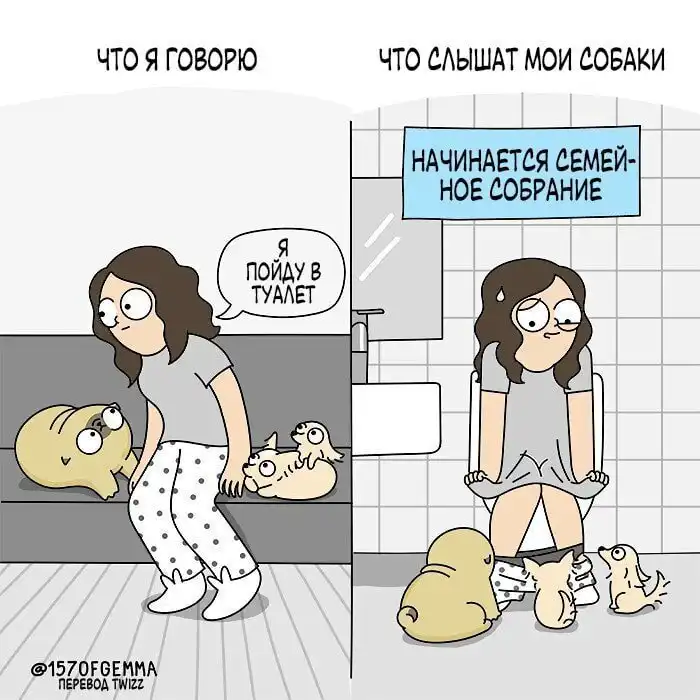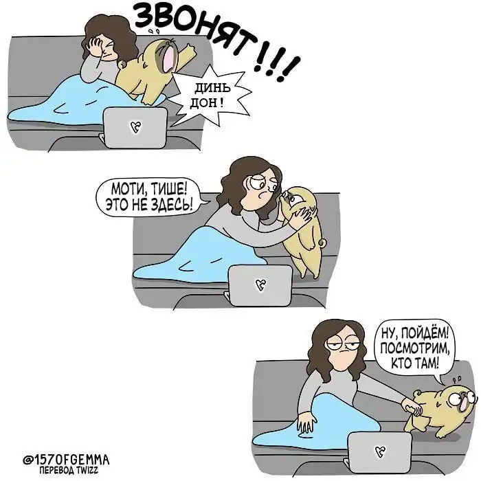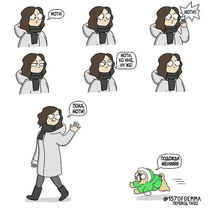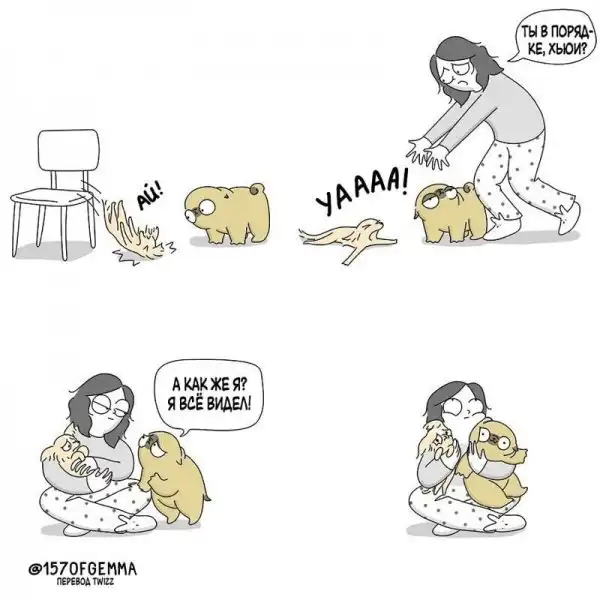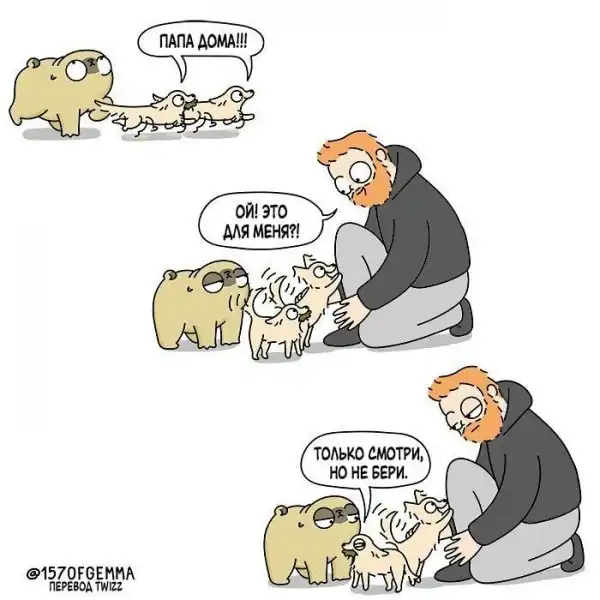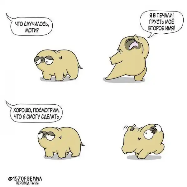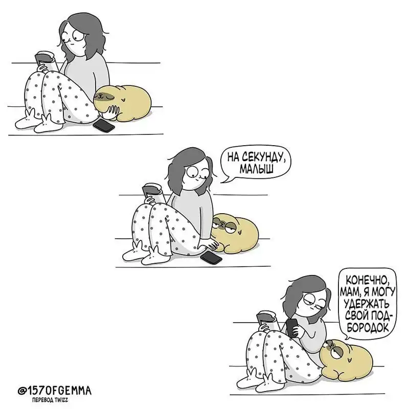 А ещё она известна тем, что ведёт страничку в Инстаграме 157ofgemma, за которой следят более 290 тысяч подписчиков. Да и как не следить, когда там она публикует милые и смешные комиксы о своей жизни с мопсом по кличке Моти! Помимо этой парочки там фигурируют ещё два братишки-чихуахуа Дьюи и Хьюи и муж Джеммы Пели. Наслаждайтесь!
