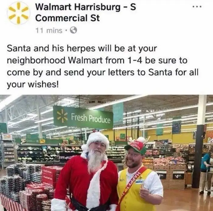 3. "Санта и его герпес будут ждать вас в соседнем Walmart c 13:00 до 16:00. Обязательно приходите и отправьте Санте письма с желаниями"