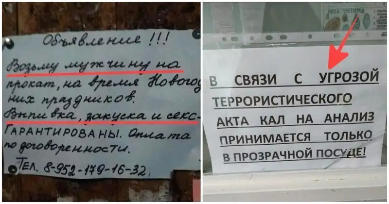 Ежедневно люди пишут объявления, сопровождая их странными, бредовыми и порой очень смешными надписями. Мы собрали самые прикольные и свежие, которые могли придумать только наши люди. Креатив так и прет!