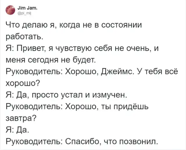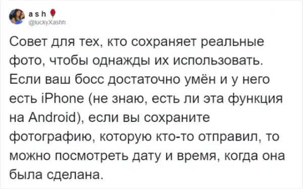 Кто из никогда не "болел", когда ну уж совсем не хотелось идти на работу? Порой двух выходных совсем не хватает. С этим согласна девушка из Оклахомы, которая тоже решила схитрить и остаться дома. Чтобы отоспаться в тишине и спокойствии, она отправила фото с доказательством того, что в офисе ее сегодня не будет ни при каких обстоятельствах. Но обман был настолько очевиден, что даже ребенок бы догадался. Знатно "обламавшись", девушка решила рассказать об этой забавной и нелепой истории в Твиттере. Ее история набрала более 246 тысяч лайков и более 45 тысяч ретвитов.