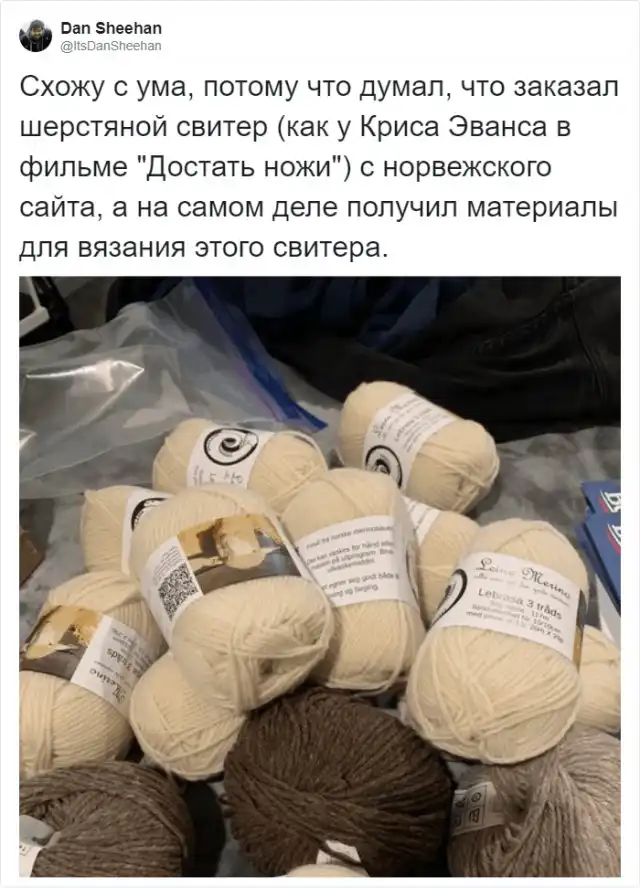 Оказалось, что он невнимательно прочитал описание товара, и поэтому ему пришла лишь пряжа – а внутри инструкция как связать его самому