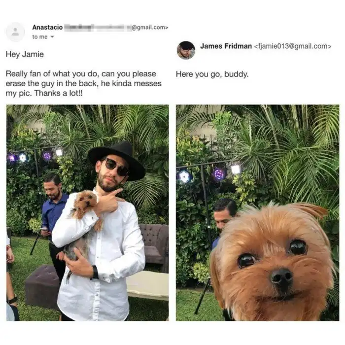 Наверняка вы слышали о Джеймсе Фридмане или как минимум видели его работы, которые несколько лет назад стали вирусными. Этот мастер фотошопа помогает своим подписчикам сделать фотографии лучше, понимая их просьбы слишком буквально. В итоге получаются шедевры, которые радуют всех, кроме изображенных на фотографии людей. Которые внезапно поняли, что своих желаний стоит опасаться.