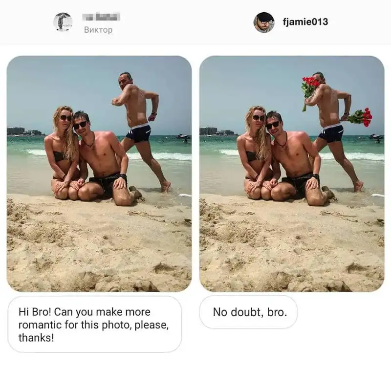14. «Мне нравится это фото с женой, но не мог бы ты убрать другого парня в белой кепке?»