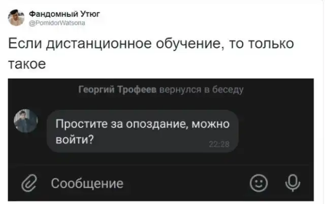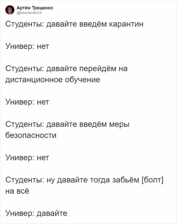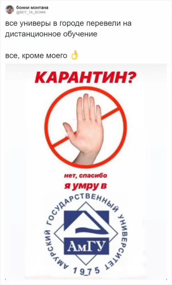 Как известно, многие учебные заведения теперь переведены на дистанционный формат работы. Причина - само собой, COVID-2019. И учащиеся школ, техникумов и университетов, разумеется, сразу же начали делать мемы на эту тему.