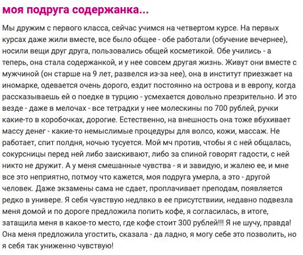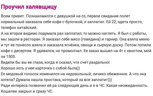 Они любят есть и пить за чужой счет. Всегда ищут выгоду из общения, а также требуют вернуть деньги за уже предоставленные услуги. Узнали кого-то из своих знакомых? Этот пост о наглых халявщицах и содержанках, готовых на все ради лишней копеечки.