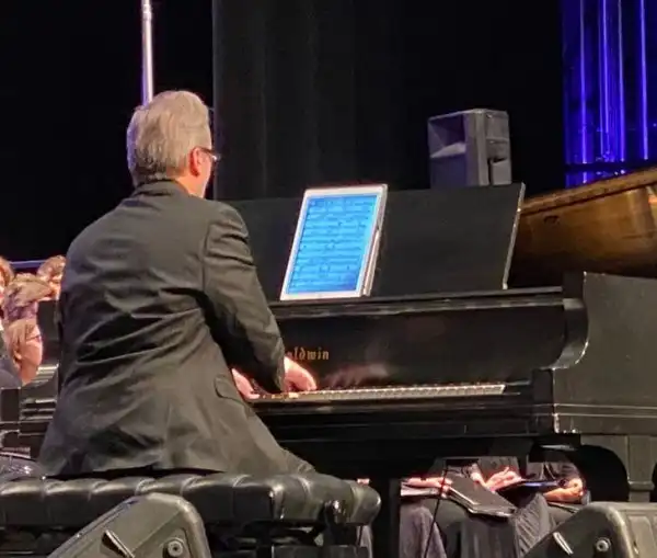 Пианист на концерте использует iPad вместо нот и просто нажимает на экран, чтобы перевернуть страницу. Времена меняются