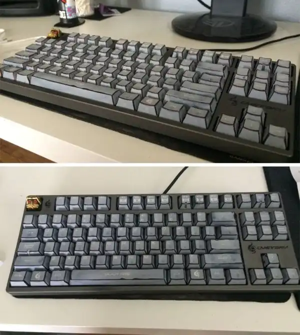Парень пролил 99% изопропиловый спирт на клавиатуру, и клавиши "поседели". Вместо того чтобы покупать новую, он решил придал кнопкам старомодный вид.