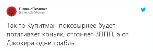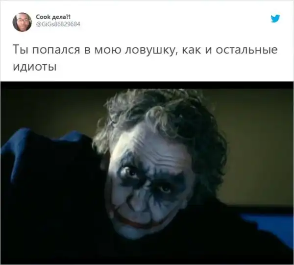 Парень хотел сделать себе крутую татуировку с Джокером. Но результат вышел совсем не таким на какой он рассчитывал. Вместо супер-злодея в исполнении Хита Леджера ему набили доктора Купитмана из сериала "Интерны". Своим фейлом он поделился в Твиттере и до слез рассмешил пользователей. При этом они утешили парня и сказали, что татуировка все равно вышла отличной.