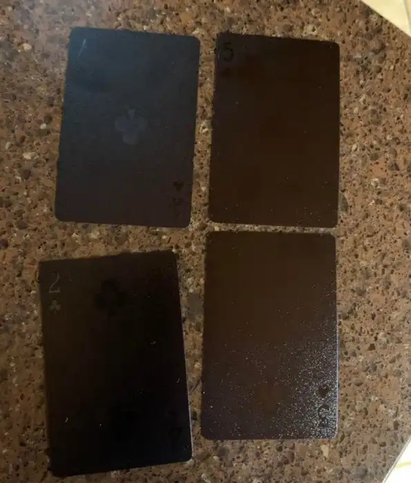 17. Черные игральные карты с черным шрифтом. Невозможно разглядеть, что тебе досталось