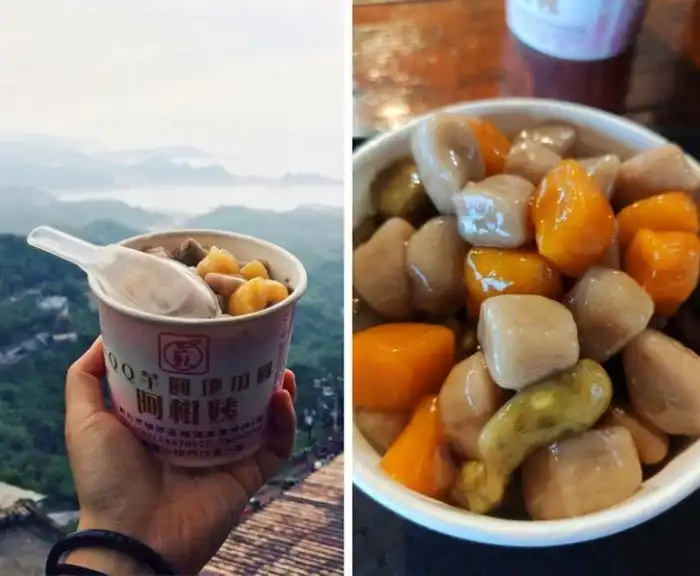 Традиционный десерт с шариками таро в Тайване. Ледяная стружка со сладким картофелем и шариками из крахмала сбрызнута коричневым сахарным сиропом. Подается с фасолью